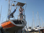21 juin 2010, par mi-oursDerniers (?) préparatifs. Le bateau va quitter le sec, le terre plein de Port Navy où il a passé deux automne-hiver-printemps. Viré à l’orange, quelques modifications de gréement. L’enrouleur a été débarqué, retour aux mousquetons.